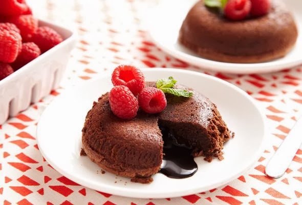 14. Place a plate over individual ramekins and turn to release. Sprinkle lava cakes with powdered sugar, mint leaves and fresh fruit, if desired