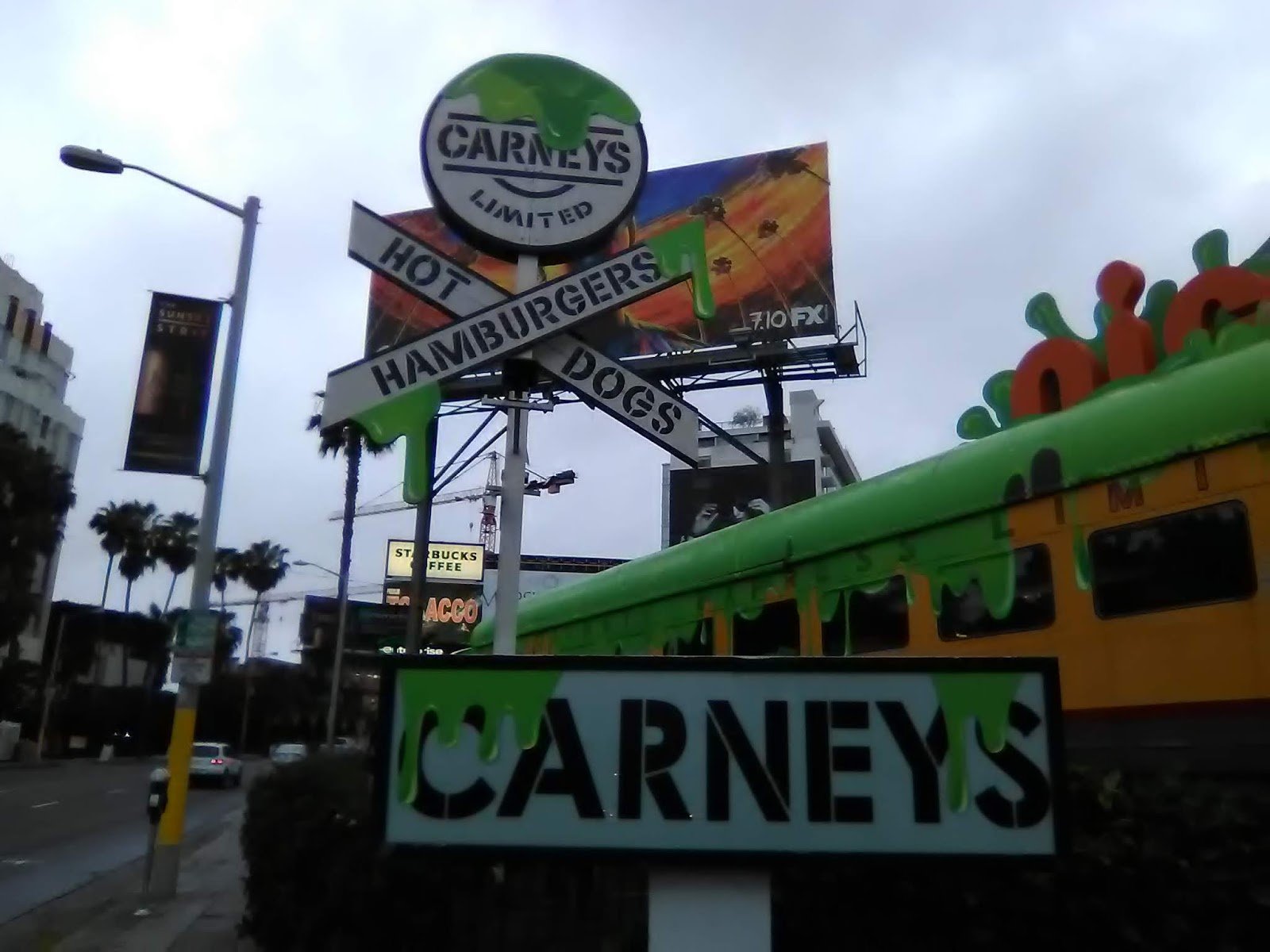The color green has hit the “Sunset Strip”. Slime has covered Carney’s restaurant at 8351 Sunset Blvd in West Hollywood, California with green paint that oozes over the roof and down the yellow sides of the train car.