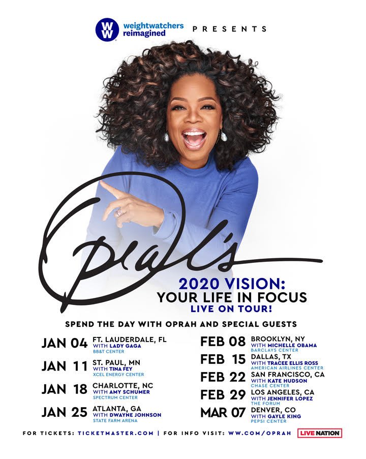 Oprah Winfrey has announced details of her upcoming tour with WW (Weight Watchers Reimagined), including special guests for all nine arena shows. Oprah will sit down for an intimate one-on-one conversation with Lady Gaga in Ft. Lauderdale, FL, Tina Fey in St. Paul, MN, Amy Schumer in Charlotte, NC, Dwayne Johnson in Atlanta, GA, Michelle Obama in Brooklyn, NY, Tracee Ellis Ross in Dallas, TX, Kate Hudson in San Francisco, CA, Jennifer Lopez in Los Angeles, CA and Gayle King in Denver, CO. Tickets are on sale now at ticketmaster.com.