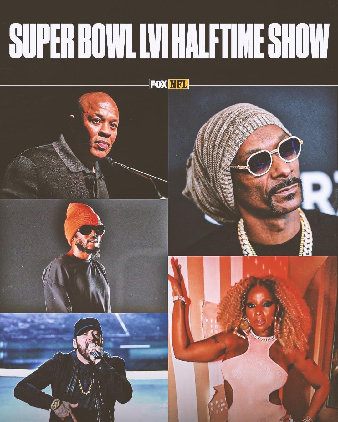Dr. Dre, Snoop Dogg, Eminem, Mary J. Blige and Kendrick Lamar will be performers at the 2022 Super Bowl LVI Halftime Show Pepsi, the NFL and Roc Nation announced.