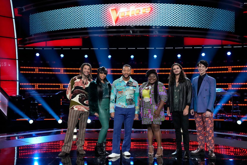 THE VOICE --Pictured: (l-r) Samuel Harness, Shadale, John Legend, Jershika Maple, David Vogel, Joshua Vicanti -- (Photo by: Greg Gayne/NBC)