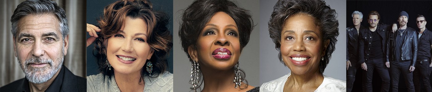 The Honorees include acclaimed actor and filmmaker George Clooney; contemporary Christian pop singer-songwriter Amy Grant; the legendary singer of soul, gospel, R&B, and pop Gladys Knight; Cuban-born American composer, conductor, and educator Tania León; and iconic Irish rock band U2, comprised of band members Bono, The Edge, Adam Clayton, and Larry Mullen Jr.