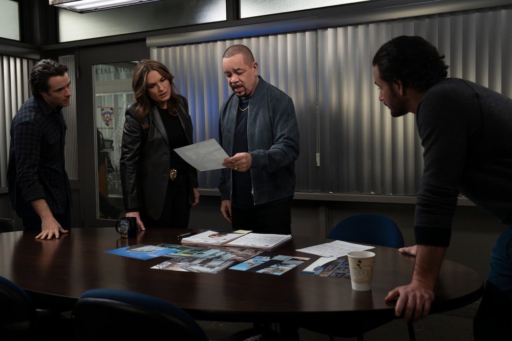 LAW & ORDER: SPECIAL VICTIMS UNIT -- "Deep Under" Episode 27017 -- Pictured: (l-r) Corey Cott as Det. Jake Griffin, Mariska Hargitay as Capt. Olivia Benson, Ice T as Sgt. Odafin "Fin" Tutuola, Kevin Kane as Det. Terry Bruno -- (Photo by: Virginia Sherwood/NBC)