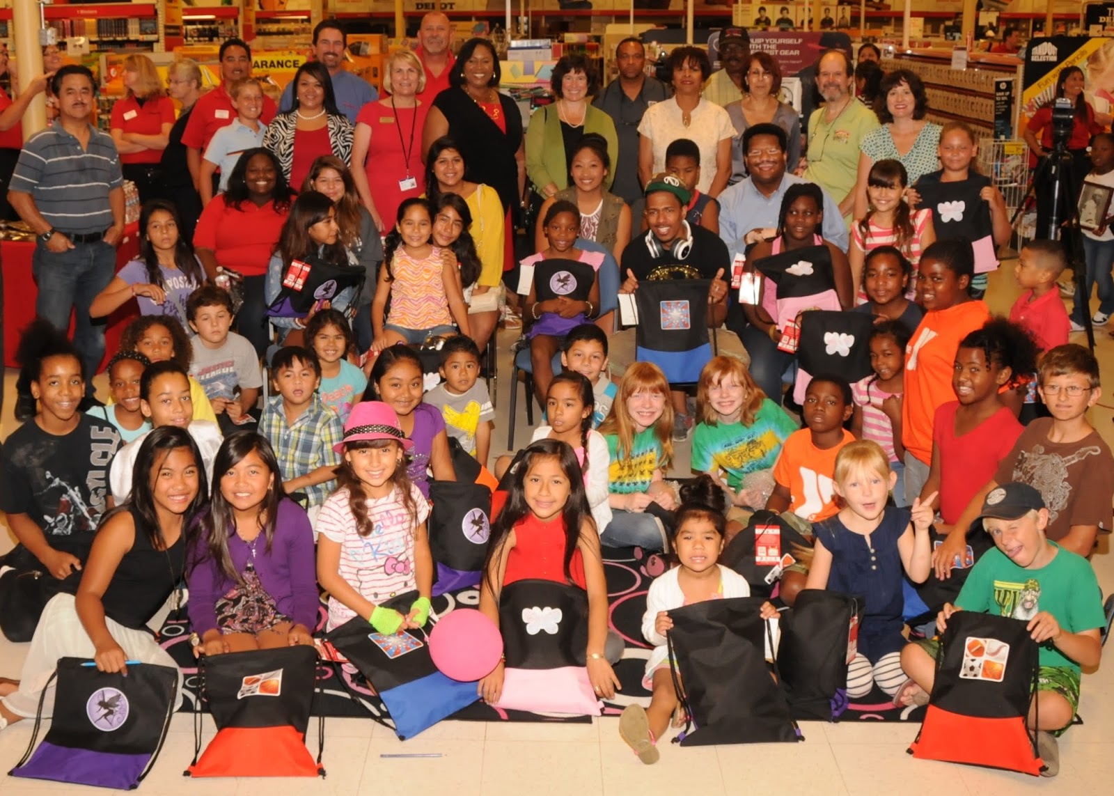 Nick Cannon surrounded by some of the recipients of 3,500 Office Depot Foundation sackpacks during a Back-to-School Celebration event at an Office Depot store in San Diego. The nonprofit organizations and schools receiving the donations included: Bayside Community Center, Pazzaz Inc., Promises2Kids, Rolling Readers, San Diego Unified School District and YMCA of San Diego County.
