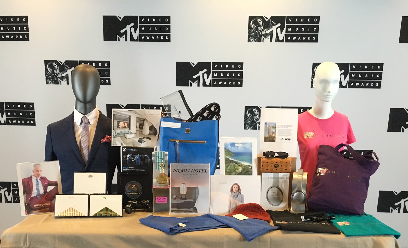 The official MTV VMA celebrity gift collection is given to Rihanna, Britney Spears, Nick Jonas and more. Tune in Sunday, 8/28 on MTV! The gift bag includes resort stays at Langham Place New York, Nobu Hotel Miami Beach, ROSALIE BAY & JW Marriott Essex House New York, Bose® headphones, bags by Dooney & Bourke, INDOCHINO suits, Marc Jacobs totes & shirts, MCM Eyewear, Scuf Gaming controllers, Perpetual Shade sleep masks, Kinross Cashmere hats and scarves, Crush by Rihanna fragrance and stationery by Crane & Co. Photo by Claire Varney
