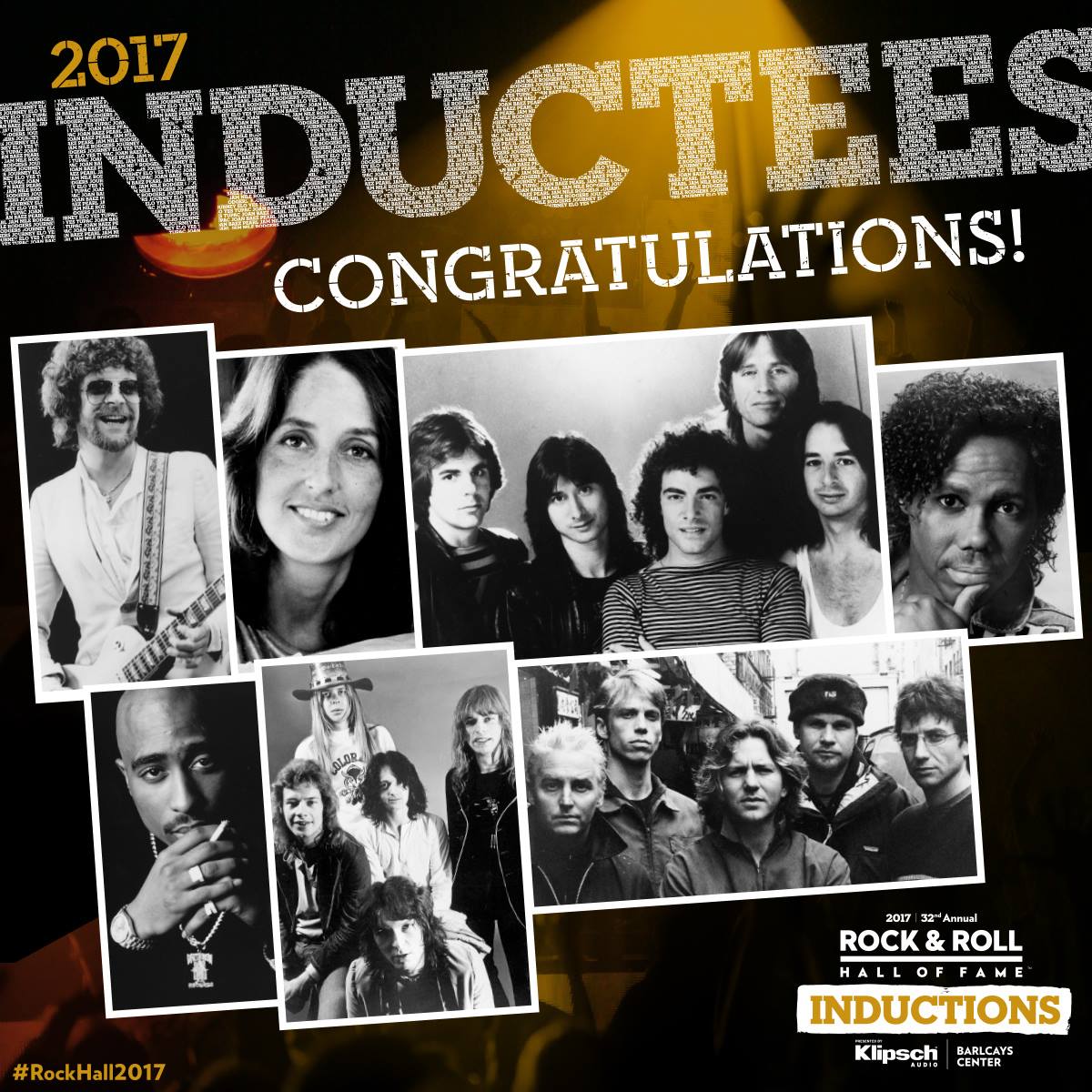 The six inductees include Joan Baez, Pearl Jam, Electric Light Orchestra (ELO), Yes, the late Tupac Shakur.