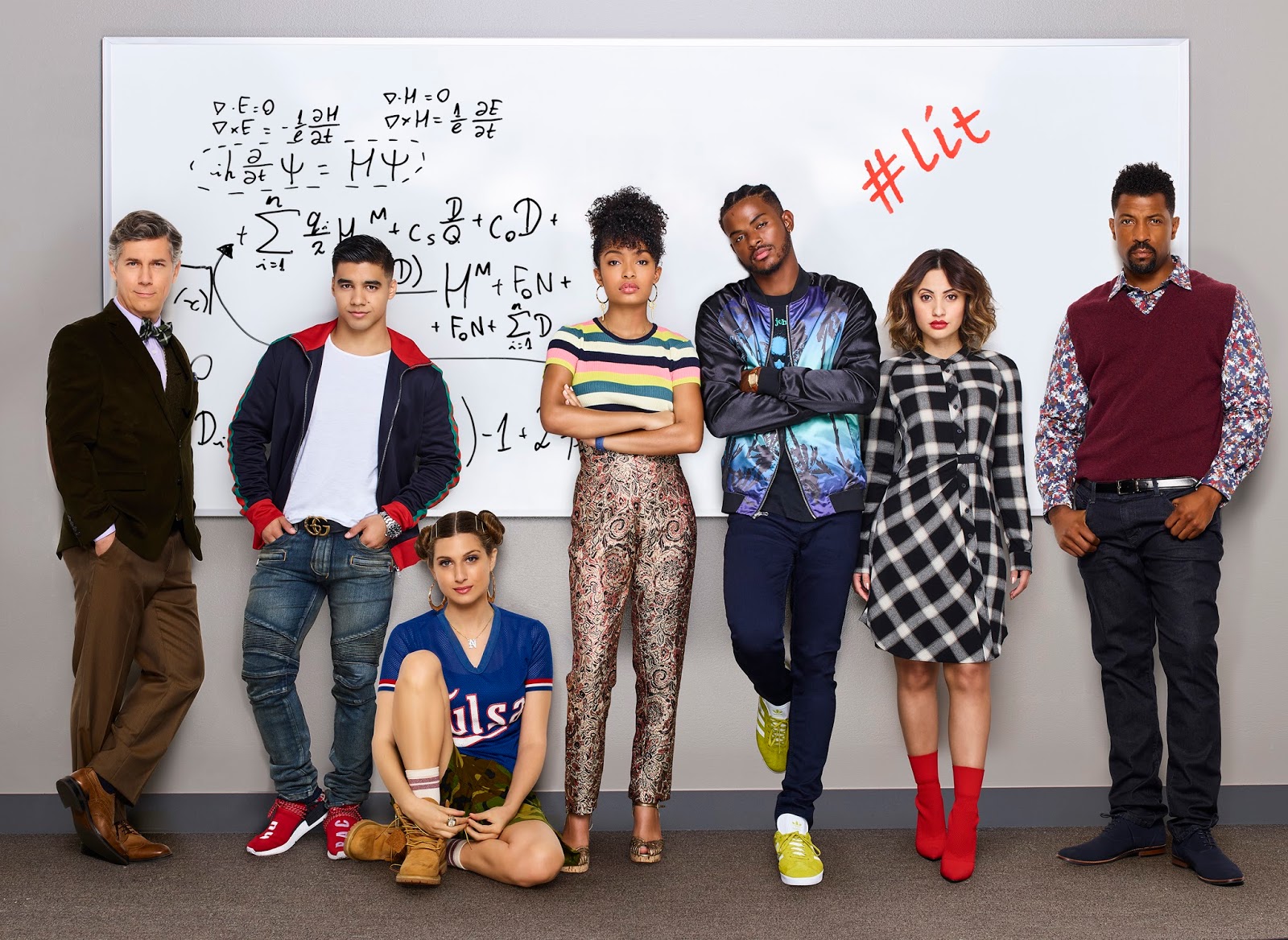 “Grown-ish” Cast: Chris Parnell as Dean Parker, Jordan Buhat as Vivek, Emily Arlook as Nomi Segal, Yara Shahidi as Zoey Johnson, Trevor Jackson as Aaron, Fancia Raisa as Ana Torres and Deon Cole as Charlie Telphy. (Freeform/Andrew Eccles)