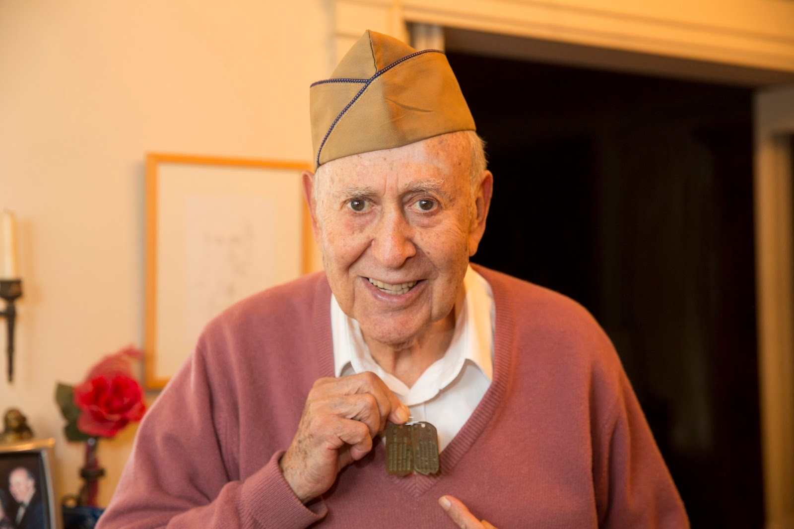 | Carl Reiner at the GI JEWS interview in his Los Angeles home, December 2014. He is wearing his army hat and holding up his dog tags, which were marked H for Hebrew. Photo: Courtesy of Turquoise Films |