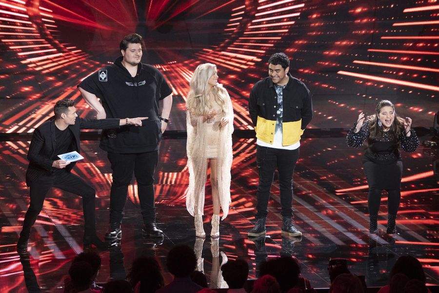 | “American Idol” host Ryan Seacrest announces the hopefuls going into the finale. (L-R): Ryan Seacrest, Wade Cota, Laci Kaye Booth, Alejandro Aranda, and Madison Vanderburg. Photo: ABC/Eric McCandless |