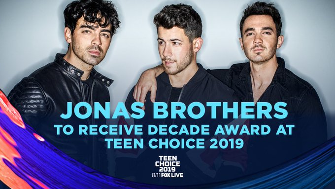 The Jonas Brothers will be honored at The Teen Choice Awards with the highly coveted Decade Award, which celebrates the group’s evolution over the past ten years. The two-hour LIVE event airs, for the first time in Teen Choice history, from Hermosa Beach, CA, on Sunday, Aug. 11 (8:00-10:00 PM ET live/PT tape-delayed), on FOX.