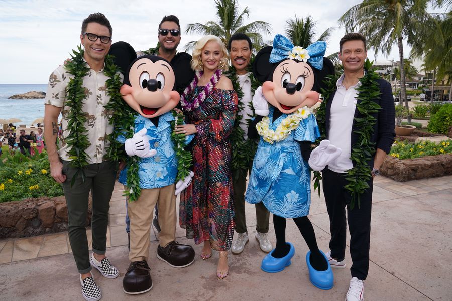 | American Idol in Hawaii Bobby Bones, Luke Byran, Katy Perry, Lionel Richie, Ryan Seacrest and Mickey Mouse and Minnie Mouse