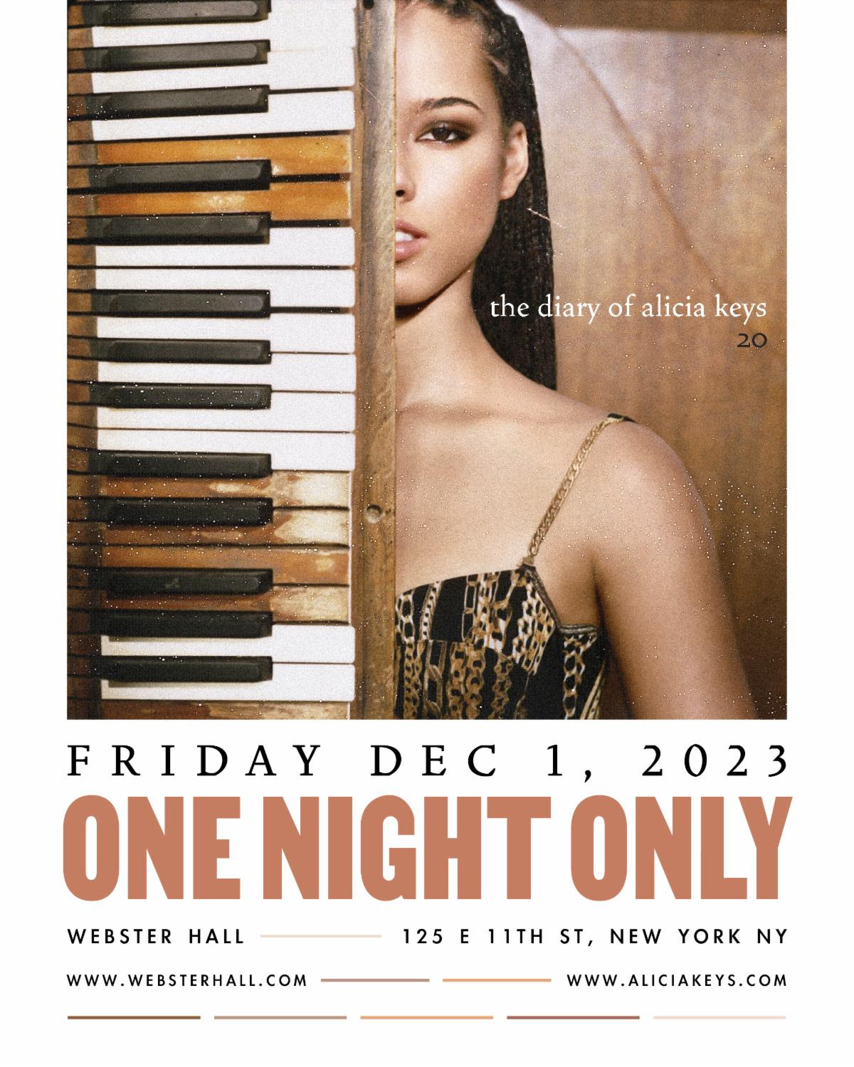 Veeps is set to Livestream Alicia Keys 20th Anniversary “The Diary Of Alicia Keys” Concert. Show Airs Friday, December 1st, 2023 at approximately 9 p.m ET.