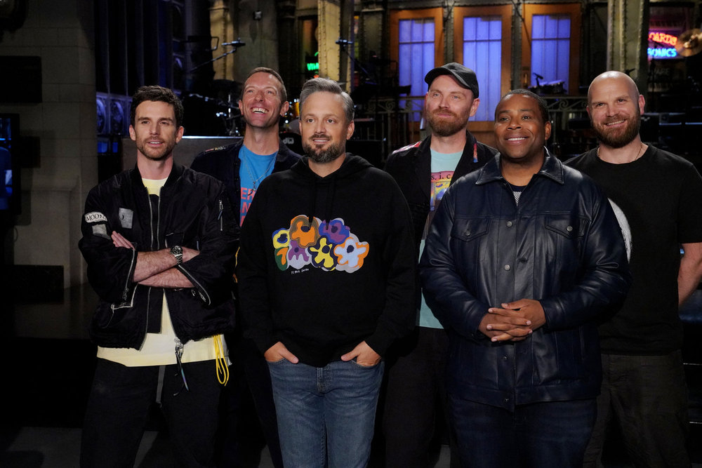 SATURDAY NIGHT LIVE -- Episode 1866 -- Pictured: (l-r) Musical guest Coldplay, host Nate Bargatze, and Kenan Thompson during Promos in Studio 8H on Thursday, October 3, 2024 -- (Photo by: Rosalind OConnor/NBC)